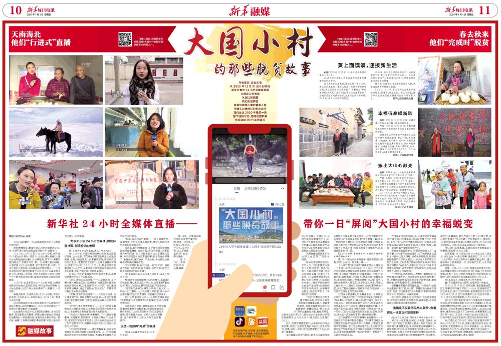 2020年12月31日0點0分0秒起,新華社26個國內(nèi)分社聯(lián)動,開啟24小時全媒體直播《大國小村的那些脫貧故事》。從白雪皚皚、零下40多攝氏度的黑龍江,到椰風習習、零上10多攝氏度的海南,從海拔超4000米的高原,到廣袤的平原,從數(shù)十萬米之遙的衛(wèi)星視角,到纖毫畢現(xiàn)的特寫鏡頭……100余名新華社記者走進散落于960萬平方公里土地上的小村,用鏡頭、用對話、用老鄉(xiāng)的皺紋與笑容,講述一個個鮮活的脫貧故事,繪就決戰(zhàn)脫貧攻堅的恢宏畫卷。