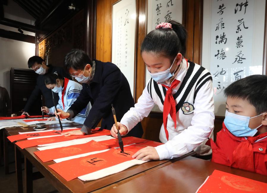 1月30日,江蘇蘇州園林博物館舉辦的“蘇州年 園林味”主題活動(dòng)啟動(dòng),10個(gè)就地過年的家庭成為首批體驗(yàn)者,孩子們與志愿者一起書寫春聯(lián)。新華社發(fā)(杭興微 攝)