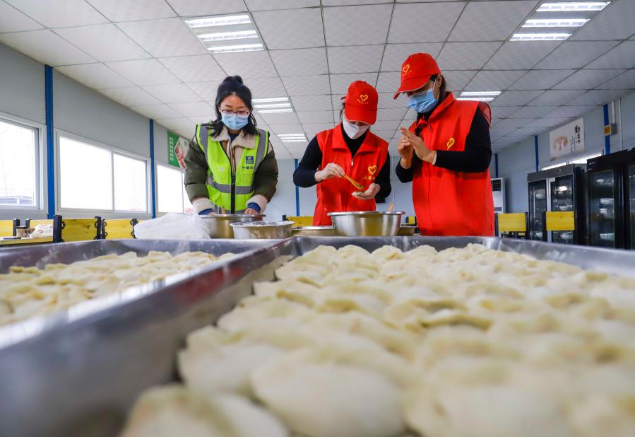 1月31日,河北唐山遵化市志愿者在京秦高速遵秦段東舊寨施工路段項(xiàng)目部駐地與工人一起包餃子。新華社發(fā)(劉滿倉(cāng) 攝)