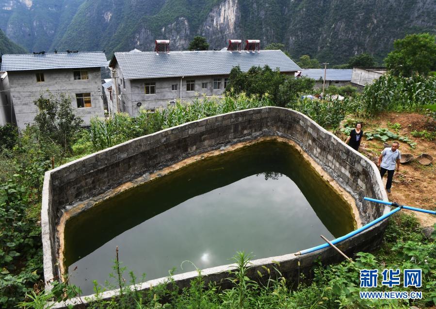 毛相林(前)經(jīng)過下莊村用于農(nóng)業(yè)生產(chǎn)的水池(2020年7月3日攝)。新華社記者 王全超 攝
