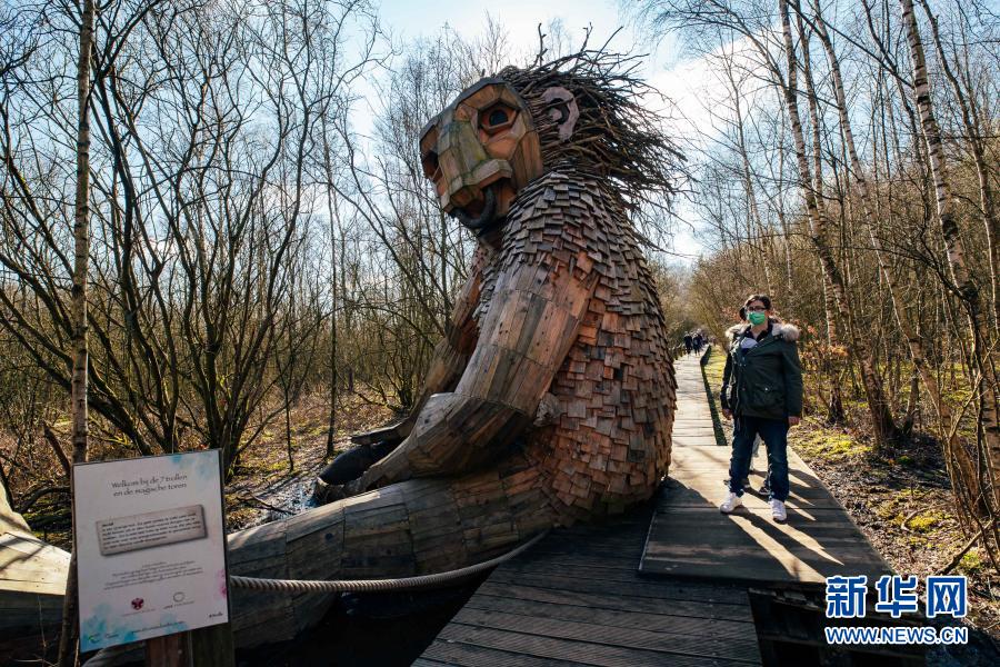 3月20日,人們?cè)诒壤麜r(shí)博姆市的德舒爾森林公園觀賞一座“巨人”雕塑。新華社記者 張鋮 攝