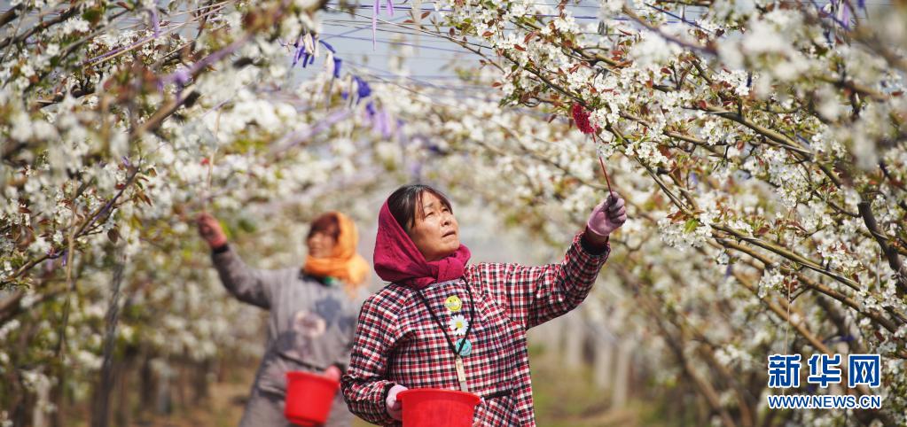 4月6日,山東濱州鄒平市長山鎮(zhèn)八方農場的果農在給梨花授粉。