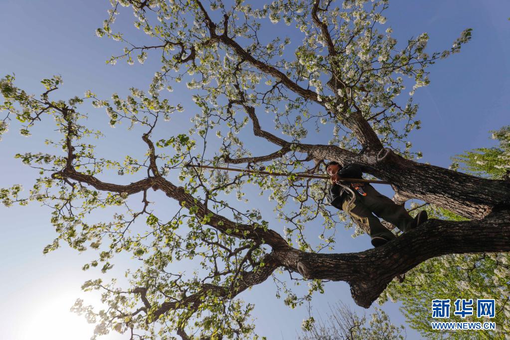 4月6日,河北唐山遵化市鐵廠鎮(zhèn)東平臺(tái)村的農(nóng)民在果園管護(hù)梨樹。