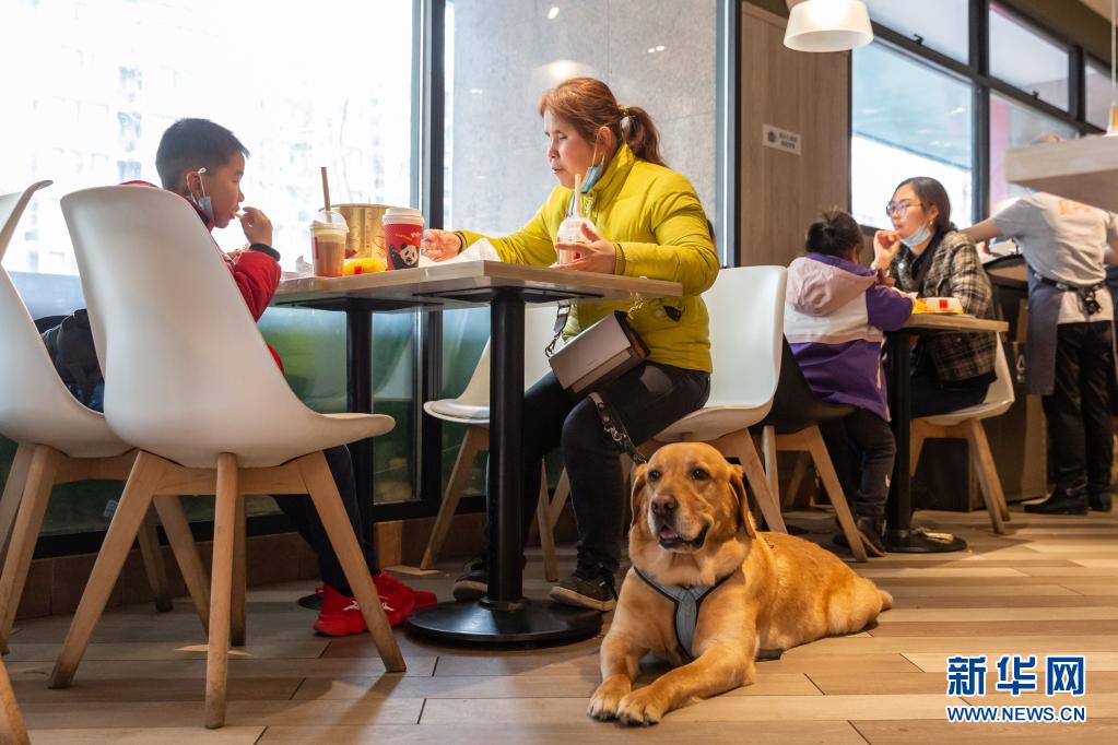 祝愛葉和兒子在餐廳吃飯的時(shí)候,導(dǎo)盲犬“多多”靜靜地趴在祝愛葉身邊(3月13日攝)。