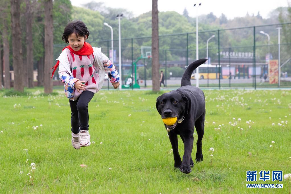 導(dǎo)盲犬“C羅”和吳虎剛的女兒在草地上玩耍(4月26日攝)?! ⌒氯A社發(fā) (張夢(mèng) 攝)