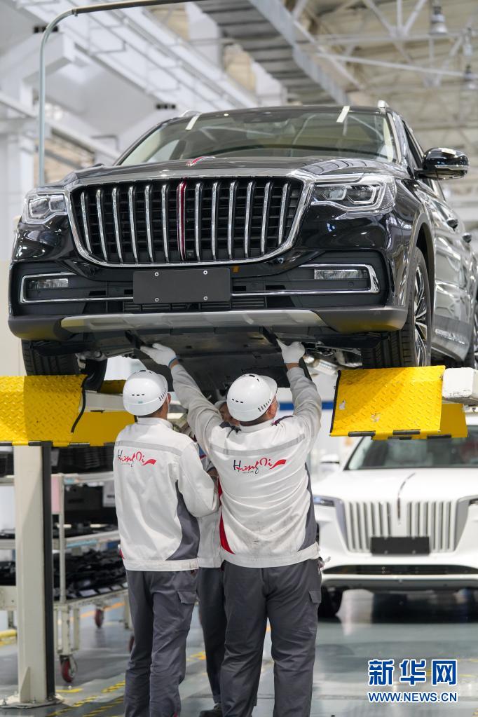 在位于吉林長春的一汽紅旗工廠總裝車間,工人在裝配車輛(4月28日攝)。