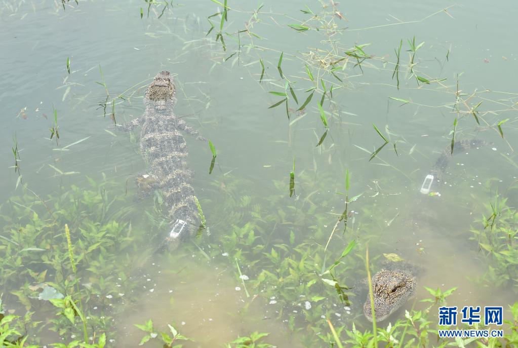 5月13日,放歸的揚(yáng)子鱷在水塘內(nèi)活動(dòng)。
