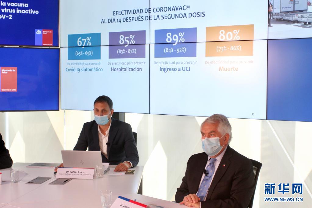 4月16日,智利衛(wèi)生部長帕里斯(右)與智利衛(wèi)生部顧問阿勞斯在圣地亞哥出席發(fā)布會(huì),公布中國科興新冠疫苗保護(hù)效果在該國的真實(shí)世界研究結(jié)果。新華社發(fā)(智利衛(wèi)生部供圖)