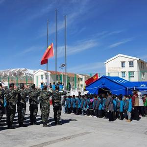 當(dāng)日是青海果洛瑪多縣花石峽鎮(zhèn)藏文中心寄宿制小學(xué)震后復(fù)學(xué)第一天,學(xué)校邀請(qǐng)他以“國家、奮斗、團(tuán)結(jié)”為主題,和孩子們進(jìn)行交流。
