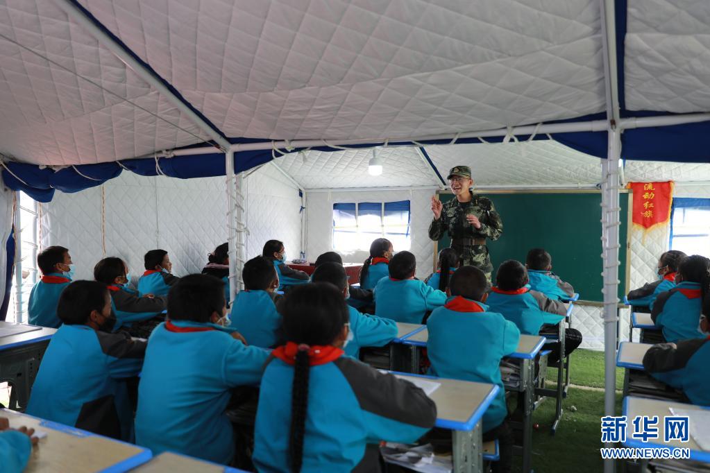 5月24日,武警青??傟牴逯ш牂C(jī)動大隊排長張國睿為花石峽鎮(zhèn)藏文中心寄宿制小學(xué)的孩子上課。新華社記者 劉新 攝