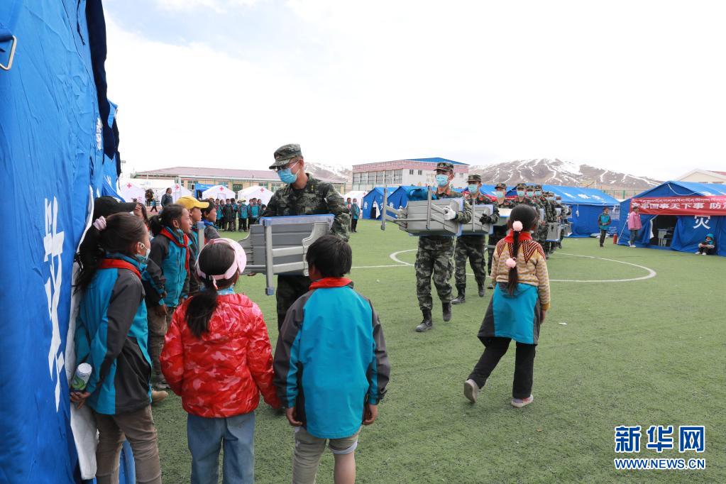 5月24日,武警青??傟牴逯ш牂C動大隊排長張國睿(前一)和戰(zhàn)友為花石峽鎮(zhèn)藏文中心寄宿制小學(xué)的帳篷教室搬運課桌。新華社記者 劉芳 攝