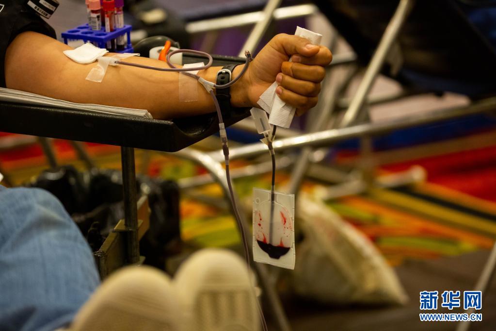 6月14日,在美國(guó)紐約州長(zhǎng)島地區(qū)的尤寧代爾,獻(xiàn)血志愿者在美國(guó)紐約血液中心舉行的獻(xiàn)血活動(dòng)上獻(xiàn)血。