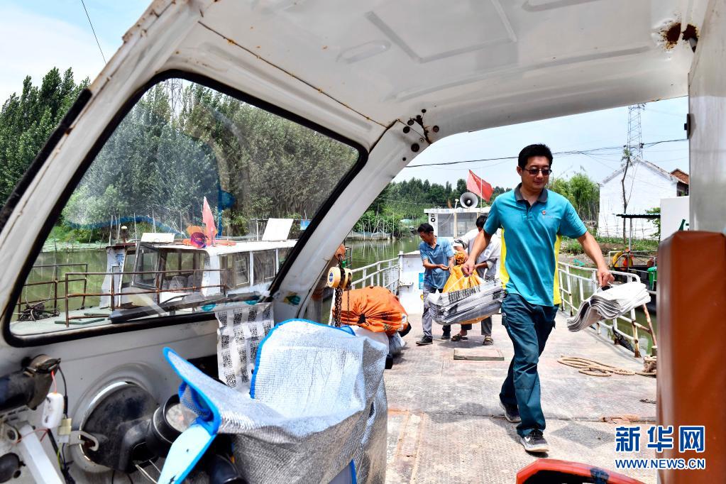 6月20日,在微山縣南陽鎮(zhèn)南陽碼頭,郵遞員王少朋從渡輪上搬卸郵件。南陽鎮(zhèn)的郵件往來全靠船進船出。