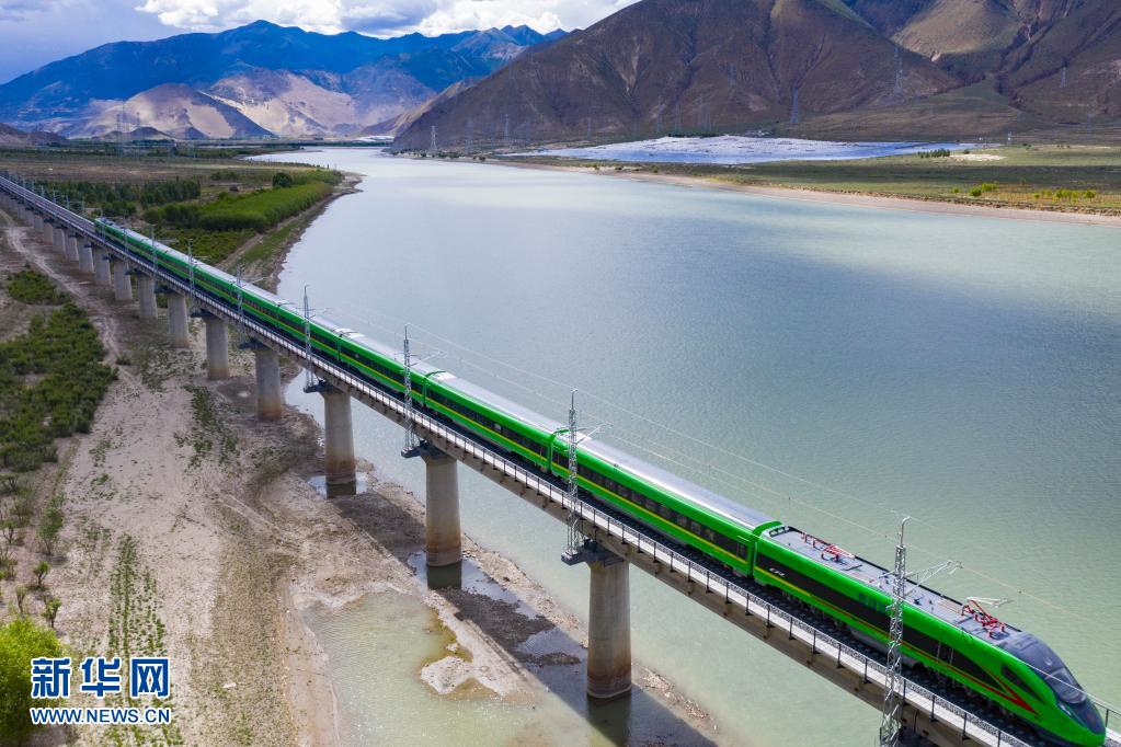 試運(yùn)行的復(fù)興號(hào)列車行駛在雅魯藏布江上(6月16日攝,無人機(jī)照片)。