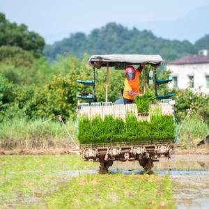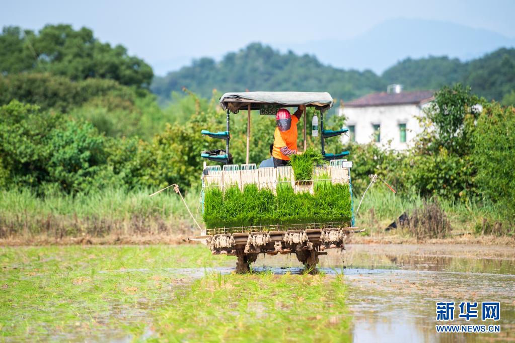 6月26日,湖南瀏陽龍伏鎮(zhèn)新開村村民駕駛插秧機在田間插秧。