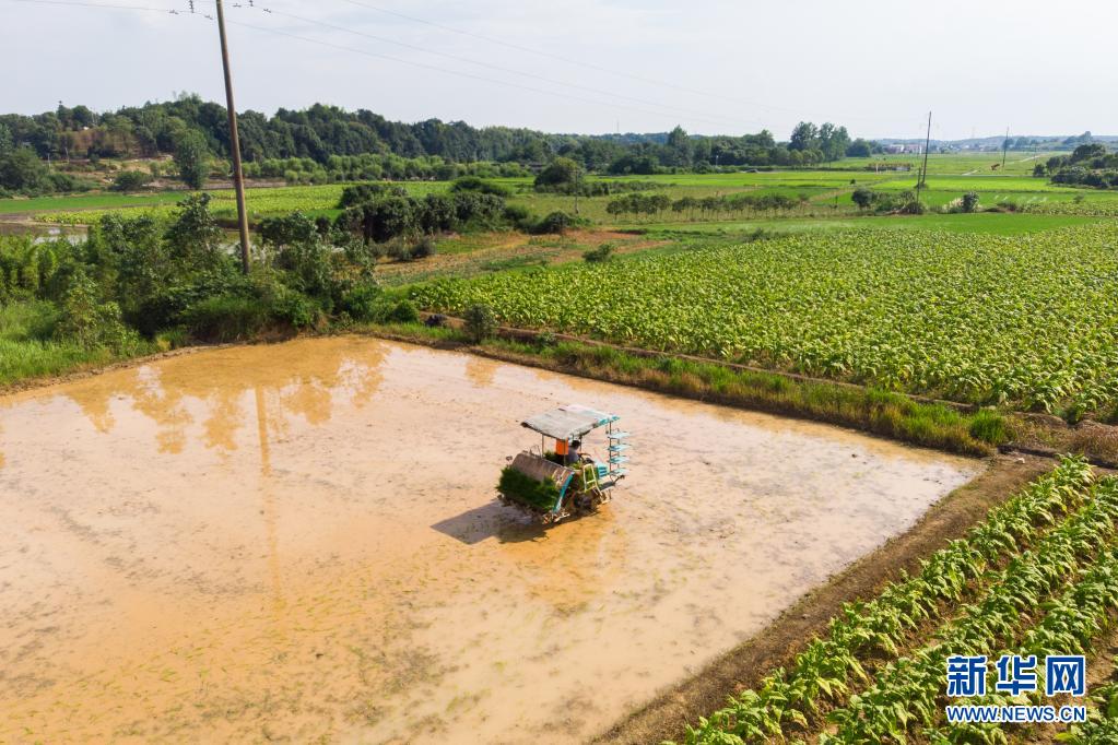 6月26日,湖南瀏陽龍伏鎮(zhèn)新開村村民駕駛插秧機(jī)在田間插秧(無人機(jī)照片)。