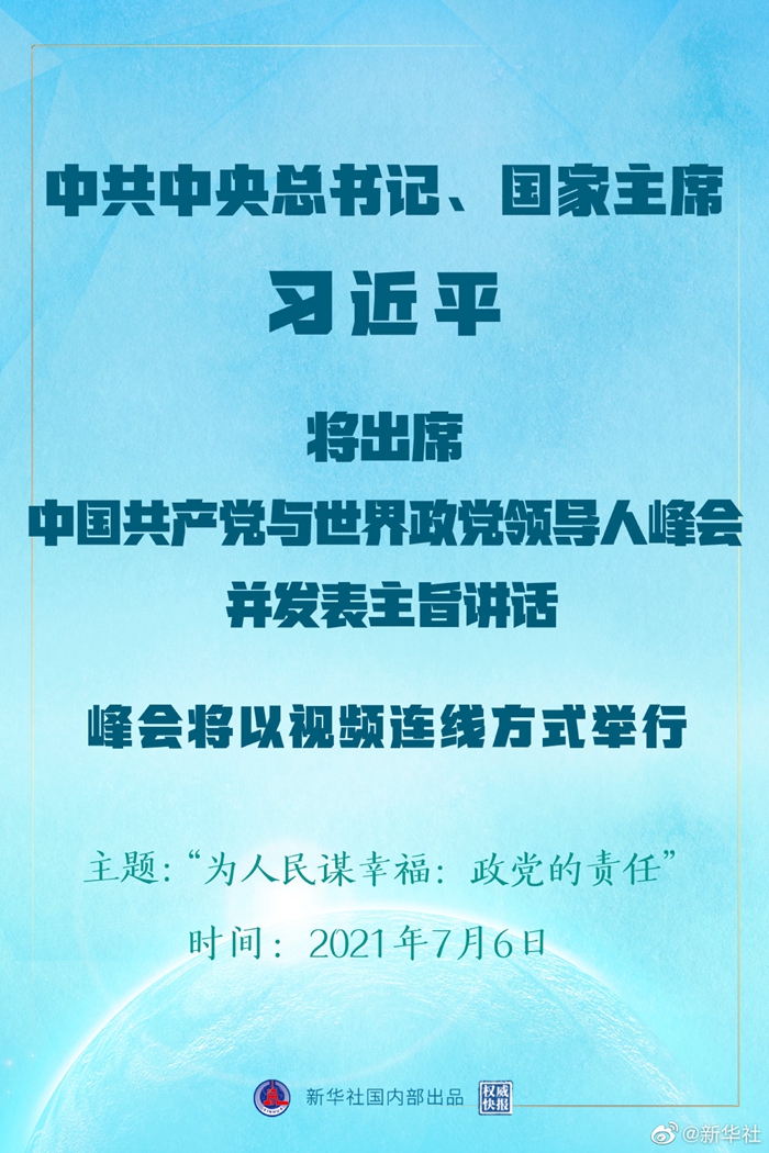 中共中央對外聯(lián)絡(luò)部發(fā)言人胡兆明5日宣布,中國共產(chǎn)黨與世界政黨領(lǐng)導(dǎo)人峰會將于7月6日以視頻連線方式舉行,中共中央總書記、國家主席習(xí)近平將在北京出席會議并發(fā)表主旨講話。此次會議的主題為“為人民謀幸福:政黨的責(zé)任”,160多個國家的500多位政黨和政治組織等領(lǐng)導(dǎo)人以及逾萬名政黨代表等將出席會議。