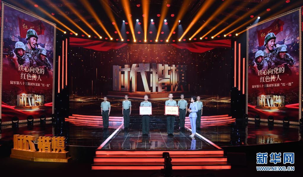 在“時(shí)代楷模”發(fā)布儀式上,陸軍第八十三集團(tuán)軍某旅“紅一連”官兵代表領(lǐng)取“時(shí)代楷?!豹?jiǎng)牌和證書(7月23日攝)。新華社記者 張永進(jìn) 攝
