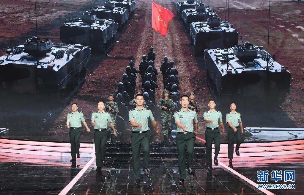 在“時(shí)代楷?!卑l(fā)布儀式上,陸軍第八十三集團(tuán)軍某旅“紅一連”官兵代表表演節(jié)目《紅色堡壘》(7月23日攝)。新華社記者 張永進(jìn) 攝