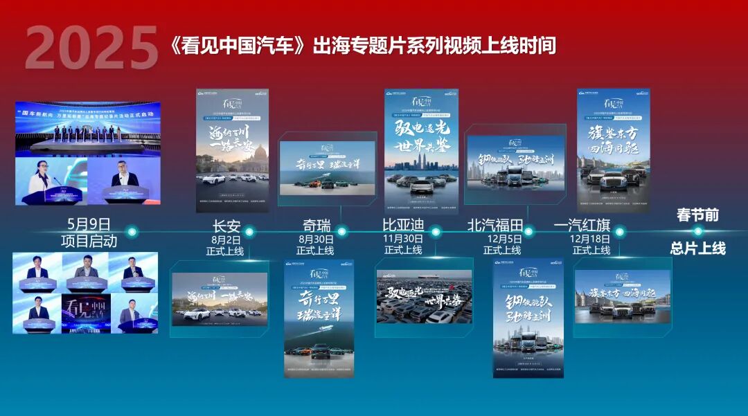 中国汽车工业协会与央视网联合推出“2025中国汽车品牌向上发展专项行动特别策划——‘国车新航向 万里拓新章’出海专题纪录片活动”,展示中国汽车在全球产业发展中的重要作用,提升中国汽车在全球舞台上的形象和影响力。此项活动于2025年5月9日中国品牌日到来之际在北京汽车博物馆正式启动。从2025年8月到12月,长安、奇瑞、比亚迪、北汽福田、一汽红旗等5部品牌独立专题片陆续上线。