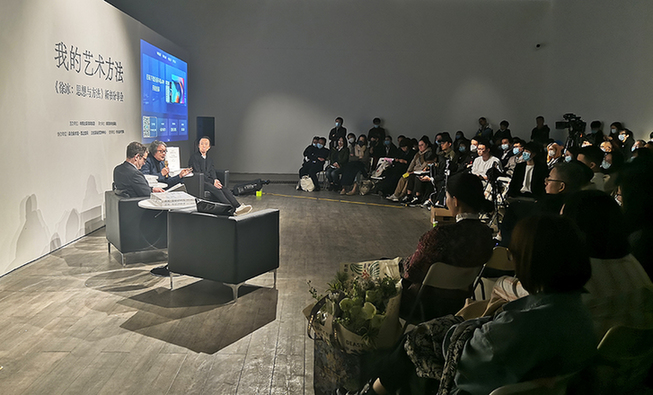 在美侖美術(shù)館·圣之空間的分享會(huì)上,徐冰就為什么要出版這本書(shū)、以及關(guān)于自己藝術(shù)創(chuàng)作的思想與方法開(kāi)啟發(fā)言;田霏宇就UCCA舉辦“徐冰:思想與方法”大展的價(jià)值選擇和影響力展開(kāi)回顧,以及身為策展人如何看待藝術(shù)家在展覽中的表現(xiàn),又如何看待藝術(shù)家出版物的水準(zhǔn)和價(jià)值等問(wèn)題展開(kāi)討論;孫華為大家分享了《徐冰:思想與方法》一書(shū)的編創(chuàng)與設(shè)計(jì)的故事,以及在運(yùn)用不同的方法構(gòu)建徐冰的展覽和畫冊(cè)獲得的啟示發(fā)表了自己的觀點(diǎn)。
