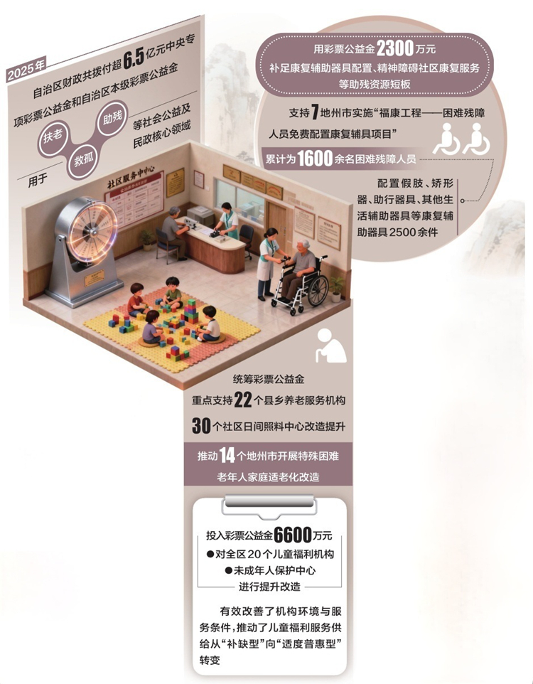 近日,记者从新疆维吾尔自治区财政厅了解到,2025年,自治区财政共拨付超6.5亿元中央专项彩票公益金和自治区本级彩票公益金,用于扶老、救孤、助残等社会公益及民政核心领域。
