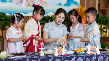9月8日,在河北省石家庄市北郡小学,小朋友在老师的指导下制作月饼。