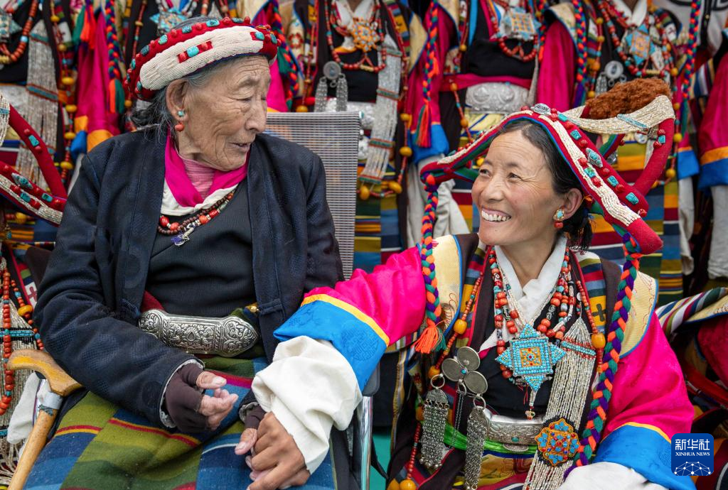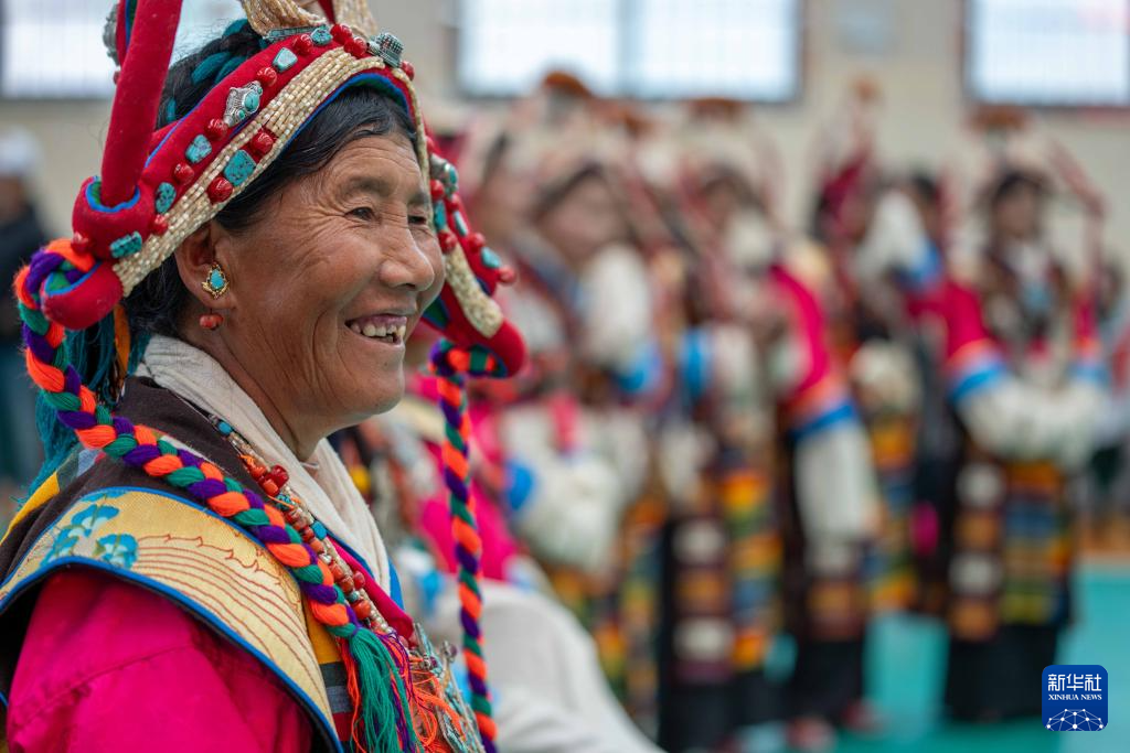 西藏日喀则市定结县,“萨尔谐钦”演职人员在整理头饰(9月25日摄)。