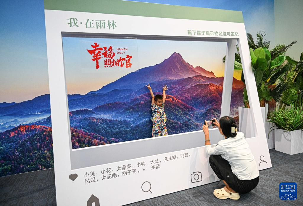 10月13日,在“守护雨林家园——海南热带雨林国家公园建设主题展”现场,观众与海南热带雨林背景墙留影。