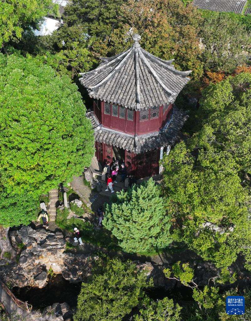 游人在狮子林参观游览(10月23日摄,无人机照片)。