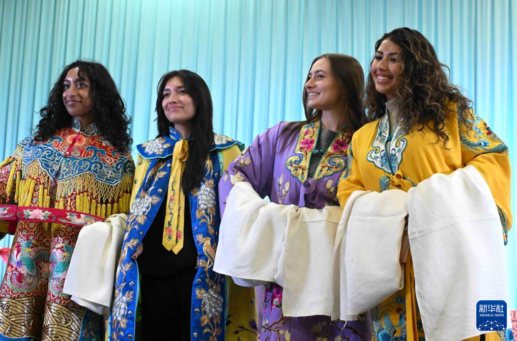 12月30日,美国大学生在河北省石家庄市京剧团体验。