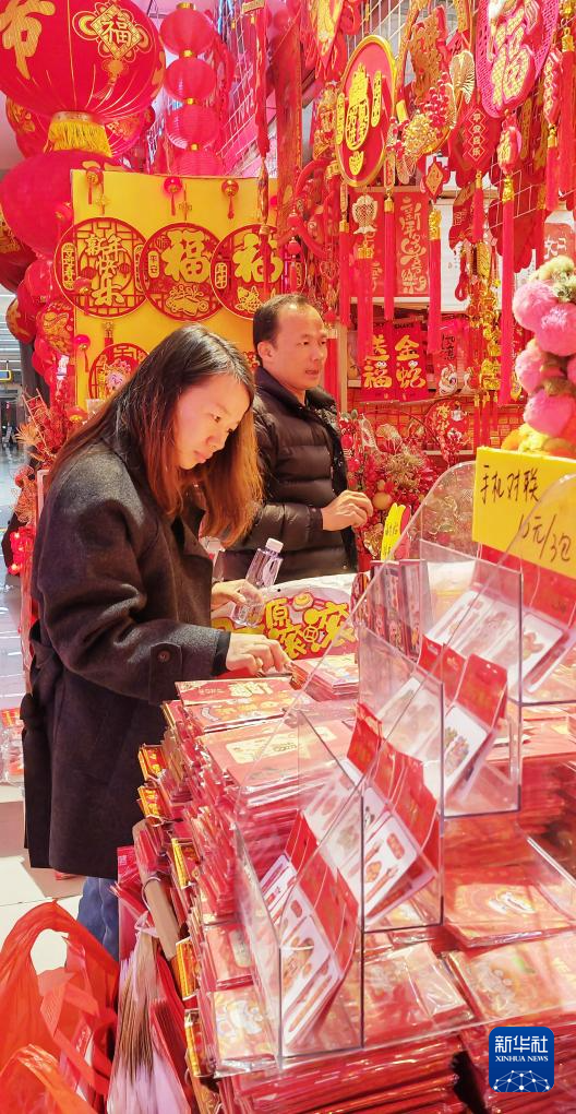 随着农历蛇年临近,广东省深圳市各大年货市场被新年饰品装扮一新,大红灯笼、春联、年画和中国结等春节饰物吸引众多市民前来选购。