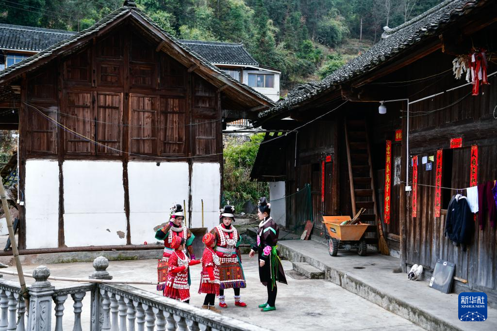 在贵州省凯里市舟溪镇舟溪村茶林苗寨,两对苗族双胞胎姐妹穿戴盛装完毕后在一起交流(2月15日摄)。