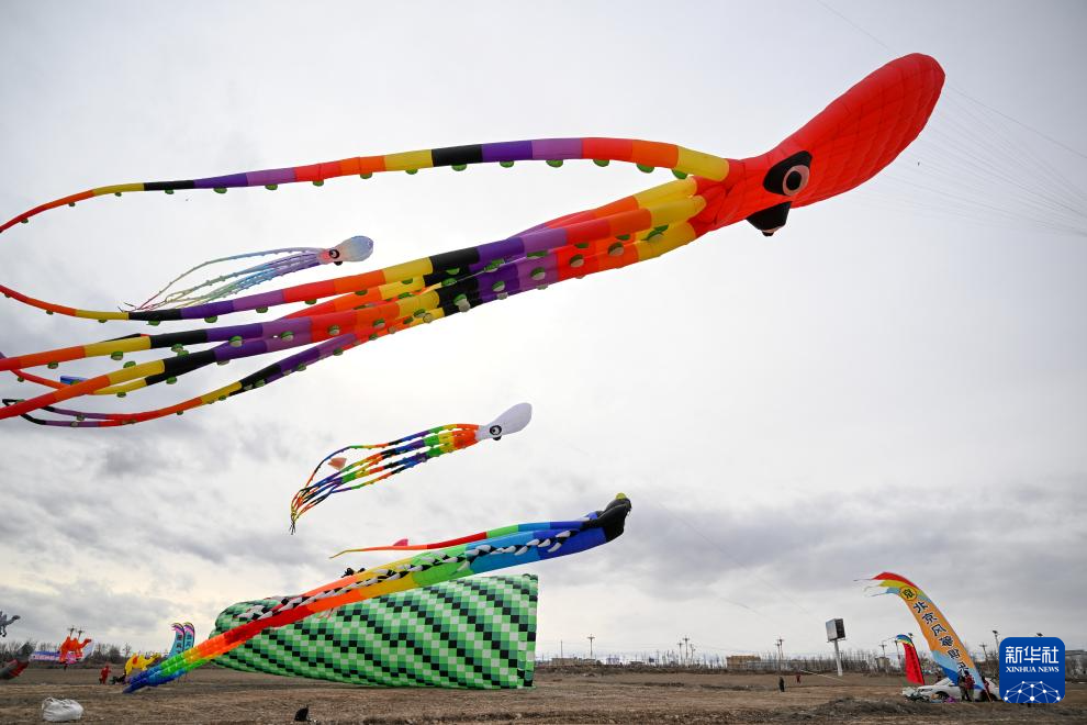 3月8日,在新疆都拉塔口岸房车露营基地,风筝爱好者放飞风筝。