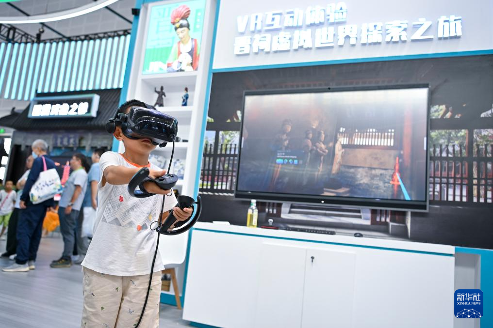 8月21日,一位小朋友在第七届山西文化产业博览交易会上通过VR设备游览晋祠。