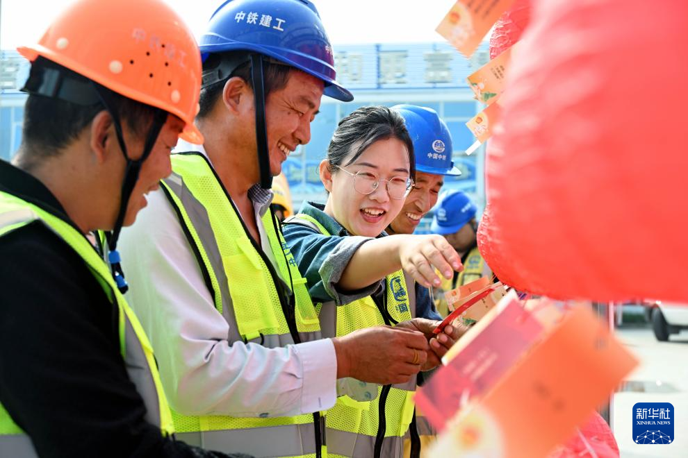9月29日,工友们在中铁建工青岛火车北站东广场项目部迎国庆班组主题活动上猜灯谜。