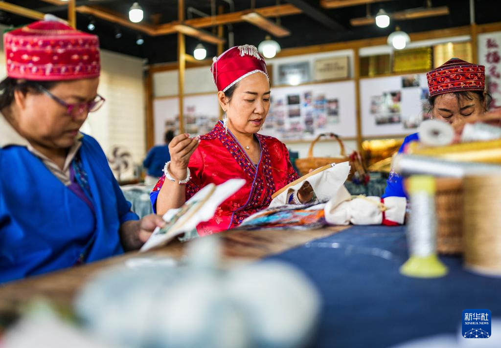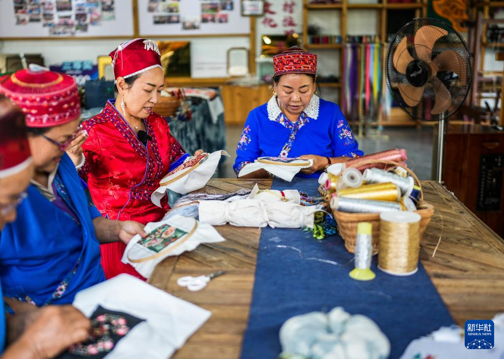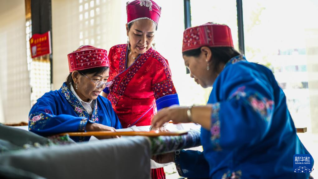 龙禄颖(左三)在位于贵州省施秉县的舞水云台非遗工坊进行刺绣创作(10月10日摄)。