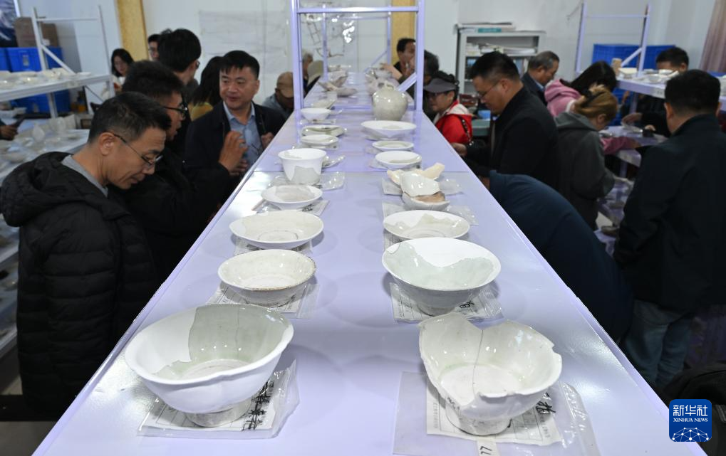 考古学家们在苏峪口瓷窑址考古队文物库房内对出土瓷器进行考察(10月13日摄)。