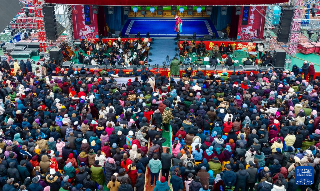 2月3日,人们在宁夏固原市西吉县年货大集上观看秦腔表演(无人机照片)。