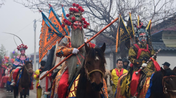 3月3日,农历正月十五,陕西省宝鸡市陇县“社火闹春·狂欢陇州”元宵社火游演火热上演。来自全县10个镇的49支社火队伍沿城区主干道前行,马社火、步社火、高芯社火等20余种社火轮番登场。