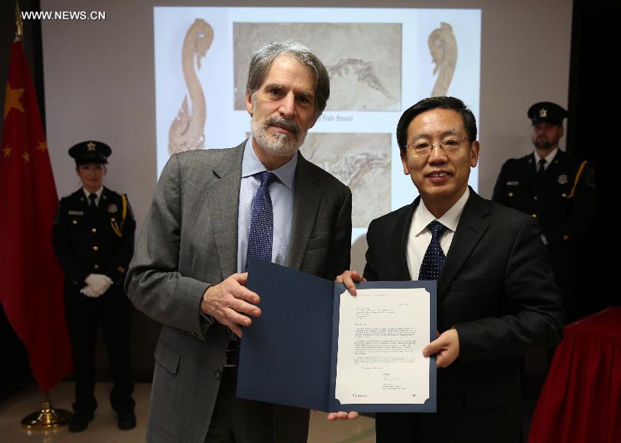 Wang Wentian (R), charge d'affaires of the Chinese Embassy in Ottawa, receives a certificate of returning the valuable cultural properties from a Canadian official in Ottawa, Canada. The Canadian Ministry of Heritage held an official ceremony in Ottawa on Wednesday to return illegally exported valuable cultural properties to China. (Xinhua/Li Baodong)