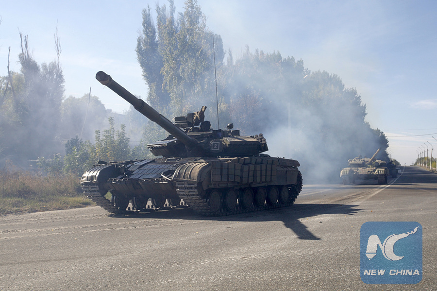 A tank is seen withdrawing from the front line in Aleksandrovsk Town, near Luhansk, Ukraine, Oct. 3, 2015. (Xinhua/Alexander Ermochenko)