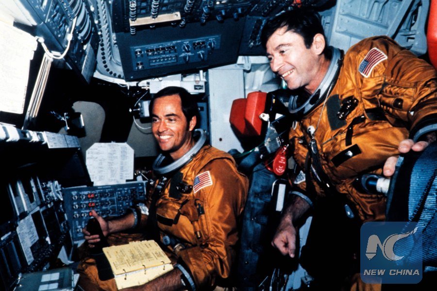 This file photo taken on April 11, 1981 shows U.S. Astronauts Robert Crippen (L) and John Young (R) in the flight deck of Columbia of the space shuttle Columbia before the first shuttle flight at Kennedy Space Center in Florida on April 12, 1981. Astronaut John Young passes away at 87. (Xinhua/AFP PHOTO/NASA)