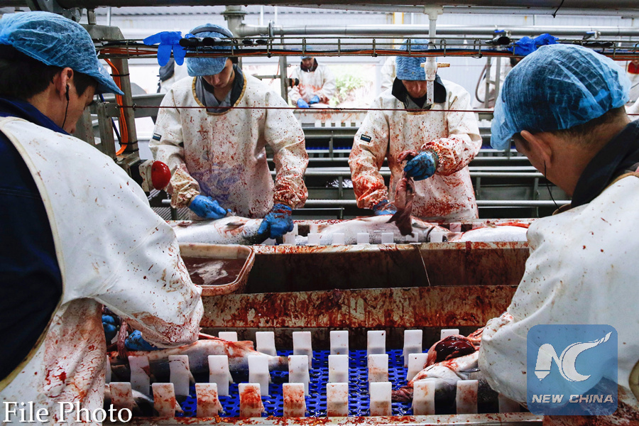 A picture taken on August 3, 2017 shows employees processing salmon at a plant in the Arctic Circle port city of Murmansk, Russia. (AFP PHOTO)