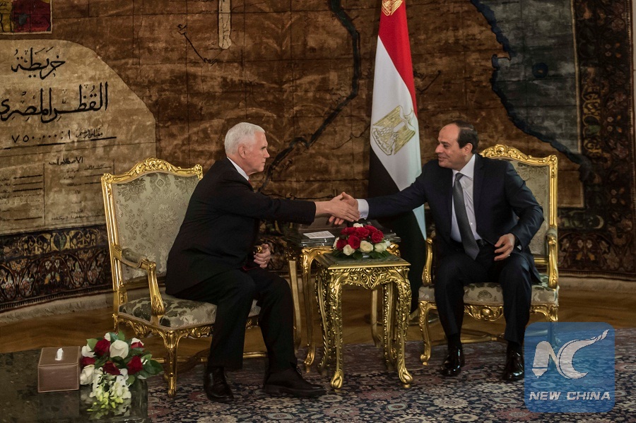 CAIRO, Jan. 20 (Xinhua) -- Egyptian President Abdel-Fattah al-Sisi reaffirmed Egypt's support for an independent Palestinian state with East Jerusalem as its capital in his talks with visiting U.S. Vice President Mike Pence on Saturday, the Egyptian presidential spokesman said in a statement.