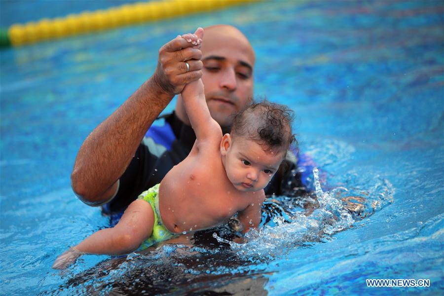 An infant swims with a trainer in Cairo, Egypt on Jan. 16, 2018. At a small closed and ceiled hygienic swimming pool in a language school on the outskirts of Cairo, a dozen of parents took their babies to attend the special swimming classes in the unique center run by international baby swimming coach Mohamed Abdel-Maksoud. (Xinhua/Ahmed Gomaa) The photo goes with the article titled "Feature: Baby swimming school warmly welcome in Egypt."
