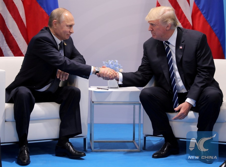 U.S. President Donald Trump shakes hands with Russia's President Vladimir Putin during their bilateral meeting at the G20 summit in Hamburg, Germany July 7, 2017.(Xinhua/REUTERS)