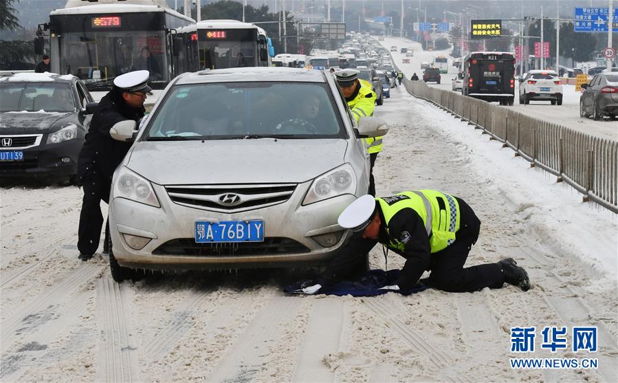 Policemen help pull a car that gets stuck in the snow on a bridge in Wuhan City, central China’s Hubei Province, Jan. 27, 2018 . (Xinhua/Jin Siliu)