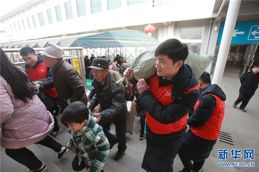 Volunteers help passengers at Kaifeng Railway Station, in central China’s Henan Province, Feb. 1, 2018. (Xinhuanet/Li Junsheng)