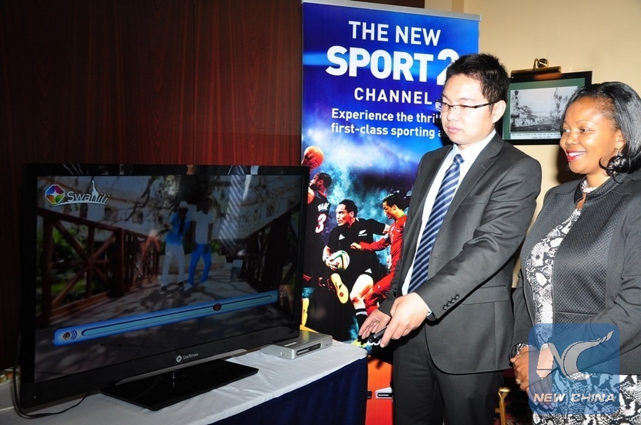 Kenya Film Commission Chief Executive Officer Lizzie Chongoti (R) and Star Times Vice President Hans Han test the Swahili channel in Nairobi, capital of Kenya, Aug. 7, 2014. (Xinhua/Allan Muturi)